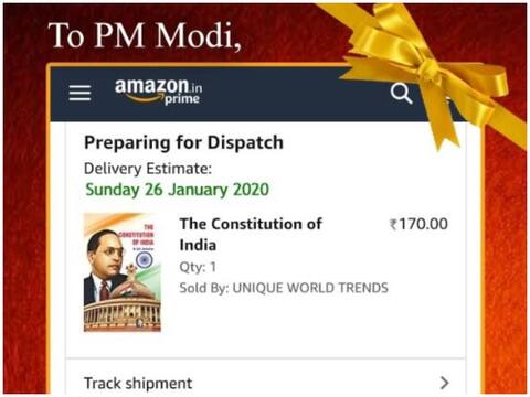 नई दिल्ली: 26 जनवरी 2020 को जब पूरा देश 71 वां गणतंत्रता दिवस मना रहा था तब विपक्षी पार्टी कांग्रेस देश के प्रधानमंत्री के नाम भारत के संविधान की प्रति भेजने की तैयारी कर रही थी. कांग्रेस ने ई-कॉमर्स वेबसाइट 'अमेजन' द्वारा भारत के संविधान की प्रति प्रधानमंत्री मोदी के नाम भेजी है. कांग्रेस ने इसकी जानकारी अपने आधिकारिक ट्विटर अकाउंट से एक तस्वीर ट्वीट करते हुए दी. कांग्रेस ने ई-कॉमर्स वेबसाइट 'अमेजन' से ऑनलाइन संविधान की प्रति खरीदने का स्क्रीनशॉट ट्वीट करते हुए इसकी जानकारी दी है. कांग्रेस ने इसके साथ लिखा, 'प्रिय प्रधानमंत्री, संविधान की प्रति जल्द आप तक पहुंच जाएगी. जब आपको देश को बांटने से समय मिल जाए तो कृपया इसे पढ़ें.'