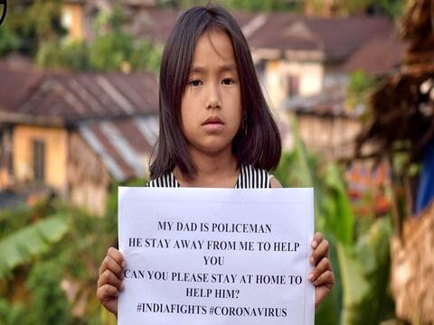 पोस्टर पर लिखा है, "मेरे पिताजी एक पुलिसकर्मी हैं. वह आपकी मदद करने के लिए मुझसे दूर रहते हैं. क्या आप उनकी मदद करने के लिए घर पर रह सकते हैं? #IndiaFights #Coronavirus".