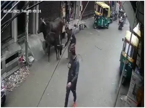 नई दिल्ली: दिल्ली के मंडावली इलाके में जानवर से क्रूरता का एक मामला सामने आया है. इस घटना का एक सीसीटीवी वीडियो वायरल हो रहा है जिसमें एक शख्स गाय के साथ खड़े उसके बछड़े को ईंट से हमला कर रहा है. दरअसल आरोपी शख्स बछड़े के पास से निकल रहा था. बछड़े ने हल्का सा सर ऊपर किया तो आरोपी घबरा गया और उसके हाथ से डॉक्यूमेंट गिर गए. फिर क्या था गुस्से में आकर शख्स ने पहले बछड़े पर लातों-मुक्कों से वार किया और फिर इतने से भी मन नहीं भरा तो ईट उठाकर बछड़े को मारना शुरू कर दिया. देखते ही देखते बछड़ा लहूलुहान होकर गिर गया.