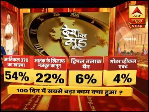 इस सर्वे में लोगों से सवाल किया गया कि 100 दिन में सबसे बड़ा काम क्या हुआ ? इस पर 54 फीसदी लोगों ने कहा कि आर्टिकल 370 के विशेष प्रावधान का खात्मा मोदी सरकार की सबसे बड़ी उपलब्धि है. वहीं आतंक के खिलाफ मजबूत कानून (UAPA बिल) को 22 फीसदी लोगों ने सरकार का सबसे बड़ा काम बताया. 6 फीसदी लोगों का मानना है कि मुस्लिम महिलाओं के लिए नया कानून यानि तीन तलाक बिल पास कराना सरकार का सबसे बड़ा काम है. वहीं चार फीसदी लोगों ने कहा कि मोटर व्हीकल एक्ट पास करना सरकार की सबसे बड़ी उपलब्धि है.