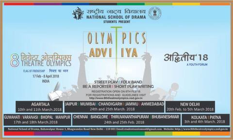 नई दिल्ली: भारत पहली बार दुनिया के सबसे बड़े अंतर्राष्ट्रीय थियेटर महोत्सव की मेजबानी करने के लिए तैयार है. इस आठवें थियेटर ओलंपिक्स के दौरान पूरे देश में नाट्य प्रस्तुतियों की श्रृंखला में 30 देश भाग लेंगे. 51 दिवसीय कार्यक्रम का उद्घाटन उपराष्ट्रपति वेंकैया नायडू 17 फरवरी 2018 की शाम 6:30 बजे लाल किले से करेंगे. इस भव्य आयोजन के अंतर्गत 17 भारतीय शहरों में 450 शो, 600 एंबिएंस प्रस्तुतियां और 250 यूथ फोरम शो किए जाएंगे, जिनमें पूरी दुनिया के 25,000 कलाकार शामिल होंगे. 8 अप्रैल 2018 को मुंबई के 'गेट वे ऑफ इंडिया' पर एक समारोह के साथ इसका समापन होगा.