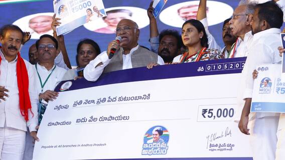 Mallikarjun Kharge Rally: कांग्रेस अध्यक्ष मल्लिकार्जुन खरगे ने आगामी आंध्र प्रदेश विधानसभा चुनव और लोकसभा चुनाव 2024 से पहले पार्टी के चुनाव प्रचार अभियान की शुरुआत सोमवार (26 फरवरी) को आंध्र प्रदेश के अनंतपुर में की और पात्र गरीब परिवारों को हर महीने 5,000 रुपये देने का वादा किया.