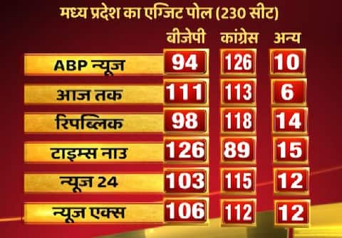 एबीपी न्यूज़-लोकनीति(CSDS) के एग्जिट पोल के नतीजे के मुताबिक कांग्रेस एमपी में बीजेपी के 15 सालों के शासन को इस बार हटाने की स्थिति में दिख रही है. एबीपी न्यूज़ के एग्जिट पोल के मुताबिक 230 विधानसभा सीटों वाली मध्य प्रदेश में कांग्रेस को 126 सीटें मिलती दिख रही हैं, तो बीजेपी को 94 सीटें और अन्य को 10 सीटें मिलने की संभावना है.