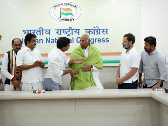 Telangana Leaders Joins Congress: कांग्रेस ने तेलंगाना के सीएम केसीआर (KCR) की पार्टी बीआरएस (BRS) को बड़ा झटका दिया है. पूर्व सांसद पोंगुलेटी श्रीनिवास रेड्डी (Ponguleti Srinivas Reddy), तेलंगाना के पूर्व मंत्री जुपल्ली कृष्णा राव (Jupally Krishna Rao) समेत 35 नेता सोमवार (26 जून) को कांग्रेस में शामिल हो गए. कांग्रेस अध्यक्ष मल्लिकार्जुन खरगे और राहुल गांधी (Rahul Gandhi) की मौजूदगी में इन नेताओं ने पार्टी का हाथ थामा.