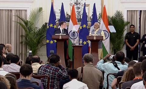 1.30 AM: हैदराबाद हाउस से फ्रांस के राष्ट्रपति मैक्रों के साथ ज्वाइंट प्रेस कॉन्फ्रेंस में बोलते हुए पीएम मोदी ने कहा, "भारत-फ्रांस की साझेदारी सदियों पुरानी है. रक्षा और अंतरिक्ष के क्षेत्र में दोनों देश का सहियोग का इतिहास भी पुराना है. हर सरकार में भारत-फ्रांस रिश्ते मज़बूत होते रहे हैं. हमारी मुलाकात दो सभ्यताओं का मिलन है. हम मिलकर वैश्विक चुनौतियों का सामना करेंगे." पीएम ने कहा कि डिफेंस के सेक्टर में 'मेक इन इंडिया' के तहत हम फ्रांस के निवेश का स्वागत करते हैं. वहीं उन्होंने द्विपक्षीय रिश्तों में ताज़ी पहल पर बात करते हुए कहा कि शिक्षा योग्यता को दोनों देश मानेंगे. भारत की डिग्री फ्रांस में मान्य होगी. दोनों देशों ने ज्वाइंट स्ट्रैटिजिक विजन भी बनाया है. पीएम ने आगे कहा कि हम मानते हैं कि हमारे संबंधों के उज्जवल भविष्य के लिए सबसे महत्वपूर्ण लोगों का लोगों (people-to-people) से संबंध है. 1.25 AM: प्रधानमंत्री मोदी- मैक्रों की वार्ता के बाद भारत और फ्रांस ने सुरक्षा, परमाणु ऊर्जा सहितअन्य क्षेत्रों में सहयोग को बढ़ावा देने वाले14 समझौते किये. मोदी-मैक्रों की वार्ता के बाद दोनों देशों के बीच गोपनीय सूचना की सुरक्षा पर भी समझौता हुआ. भारत और फ्रांस ने आतंकवाद और कट्टरता के खतरों से निपटने के लिए साथ मिलकर काम करने का फैसला लिया है. 1.03 AM: 90 मिनट से अधिक तक चली पीएम मोदी और फ्रांस के राष्ट्रपति मैक्रों की मुलाकात.