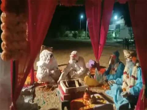 वीडियो में लड़का लड़की के अलावा सिर्फ तीन और लोग नजर आ रहे हैं. वीडियो में पंडित जी मंत्र पढ़ते हुए सभी रस्मों को पूर्ण करते दोनों की शादी कराते हुए नजर आ रहे हैं. इस दौरान दूल्हा-दुल्हन पीपीई किट पहने हुए हैं.