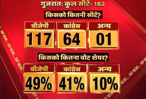 किसको कितनी सीटें? एबीपी न्यूज-सीएसडीएस एग्जिट पोल के मुताबिक गुजरात में प्रधानमंत्री नरेंद्र मोदी ने बाजी ही पलट दिया. बीजेपी एक बार फिर सत्ता में जोरदार वापसी कर रही है. गुजरात विधानसभा की कुल 182 सीटों में बीजेपी-117, कांग्रेस-64 और अन्य-01 सीटें मिल रही हैं. ये जीत साल 2012 के विधानसभा चुनाव से भी बड़ी जीत है. साल 2012 में बीजेपी को 115 सीटें मिली थीं.