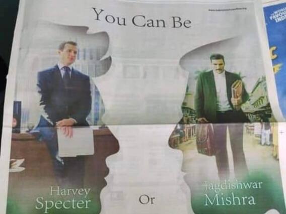 क्या कहता है विज्ञापनबता दें कि यह फुल पेज विज्ञापन इंदौर इंस्टीट्यूट ऑफ लॉ का है. इसमें लिखे हुए टेक्सट को पढ़ने के लिए दो किरदारों की तस्वीरें हैं, "आप हार्वे स्पेक्टर या जगदीश्वर मिश्रा हो सकते हैं, पसंद आपकी है". हार्वे स्पेक्टर को अमेरिकन सीरीज 'सूट' से काफी पहचान मिली थी. उस सीरीज में वह एक महंगे वकील का किरदार निभाए थे. जबकि, जगदीश्वर मिश्रा लखनऊ के एक स्ट्रगलर वकील हैं, जो एक अनुभवी और चालाक वकील के खिलाफ कानूनी लड़ाई लड़ने की हिम्मत करते हैं और उनसे वह केस जीत भी जाते हैं.