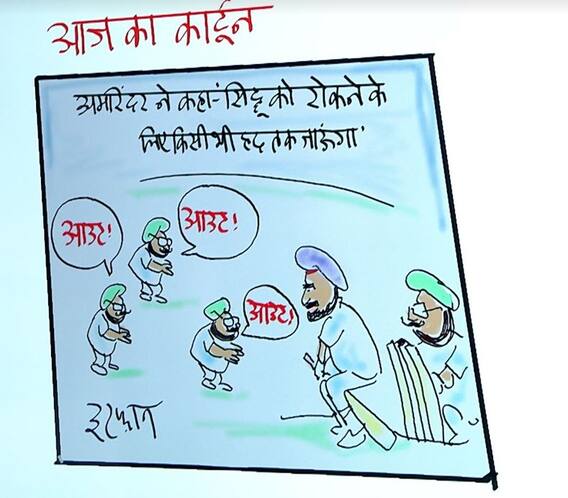 नई दिल्लीः पंजाब के मुख्यमंत्री पद से हटाए जाने के बाद कैप्टन अमरिंदर सिंह ने पार्टी के प्रदेश अध्यक्ष नवजोत सिंह सिद्धू के खिलाफ मोर्चा खोल दिया है. इस दौरान पूर्व मुख्यमंत्री अमरिंदर सिंह ने कहा कि सिद्धू को रोकने के लिए किसी भी हद तक जाउंगा. कैप्टन के बयान के बाद मामला गरमा गया है. इसी मुद्दे पर मशहूर कार्टूनिस्ट इरफान ने अपने कार्टून के जरिए कटाक्ष किया है. कार्टूनिस्ट इरफान का कहना है कि सिद्धू की घेराबंदी के लिए वह ऐसा कर देंगे कि हर जगह उन्हें कैप्टन ही कैप्टन नजर आएगा. कार्टून में क्रिकेट के मैदान पर सिद्धू को घेरते हुए दिखाया गया है जहां चारो ओर हर फिल्डर में कैप्टन ही नजर आ रहा है.