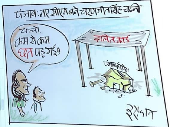 कांग्रेस आलाकमान ने भले ही एक दलित नेता को पंजाब का मुख्यमंत्री बना दिया है. लेकिन पंजाब कांग्रेस की अंदरुनी लड़ाई अभी खत्म नहीं हुई है. कैप्टन अमरिंदर सिंह अभी भी नाराज हैं. वह चरणजीत सिंह चन्नी के शपथ समारोह में नहीं पहुंचे. अंदरुनी विवाद ज्यों का त्यों बना हुआ है. मशहूर कार्टूनिस्ट इरफान ने इसी मुद्दे पर कार्टून बनाया है. कार्टूनिस्ट इरफान ने कहा, ये कार्टून कांग्रेस की जुगाड़ पॉलिटिक्स के ऊपर है. कांग्रेस ने पंजाब के अपने ढांचे को दुरस्त करने की बजाये उसपर दलित छप्पर (तिरपाल) डाल दिया है. ये छप्पर छोटी मोटी बारिश का सामना तो कर लेगा. लेकिन क्या आगे आने वाले तूफान का सामना कर पाएगा, ये देखना दिलचस्प होगा.