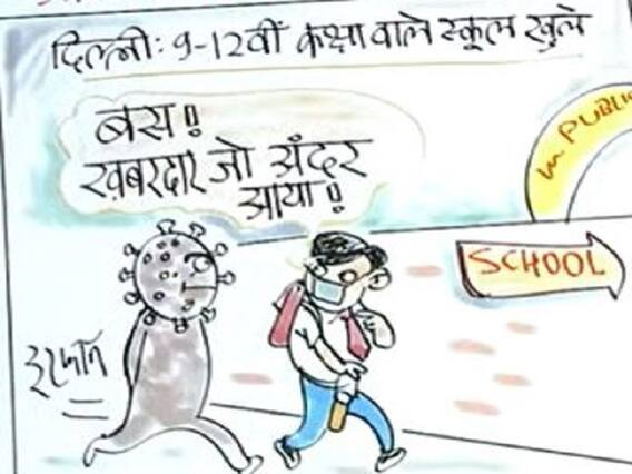 कोरोना महामारी की तीसरी लहर की आशंका के बीच देश की राजधानी दिल्ली में 9वीं से 12वीं तक के स्कूल खुल गए हैं. उधर कोरोना वायरस के मामले भी बढ़ रहे हैं. ऐसे में कोरोना की तीसरी लहर का संकट बढ सकता है. मशहूर कार्टूनिस्ट इरफान ने अपने कार्टून के जरिए कोरोना से सावधान किया है. अपने कार्टून के बारे में बताते हुए इरफान ने कहा, 'चलो स्कूल चले हम. ये मैं नहीं कह रहा हूं, ये कोरोना कह रहा है क्योंकि दिल्ली में स्कूल खुल चुके हैं. कोरोना ने बहुत तैयारी की हुई है. इसलिए ध्यान रखना है कि खबरदार अगर कोरोना को स्कूल के अंदर आने दिया. बच्चों और उनके माता-पिता को ध्यान रखना होगा कि कोरोना से सावधानी रखी जाए और कोरोना को स्कूल ही क्या देश से भी बाहर कर दें.'
