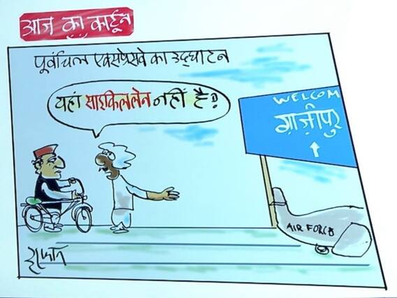 कार्टूनिस्ट इरफान के कार्टून में पूर्वांचल एक्सप्रेसवे की तस्वीर है, जिस पर लिखा है वेलकम गाजीपुर सीधे. इस कार्टून में समाजवादी पार्टी अध्यक्ष अखिलेश यादव साइकिल लिए दिख रहे हैं और उनके पास एक शख्स खड़ा है, जो उनसे कह रहा है कि यहां साइकिल लेन नहीं है!