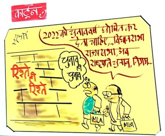 इरफान के कार्टून में दो शख्स खड़े हैं जिनके हाथ में विधायकों को पोटली या बैग देखा जा सकता है. इस कार्टून को बनाते हुए इरफान ने लिखा है, "2022 को चुनाव वर्ष घोषित कर देना चाहिए... विधानसभा, राज्यसभा, अब राष्ट्रपति चुनाव, निगम..."