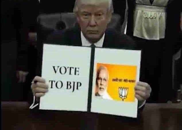 वहीं वायरल वीडियो में ट्रंप अपने दफ्तर में बैठे दिखाई दे रहे हैं जिसमें वो अपने हाथ में एक फाइल उठाते हैं जिसमें एक तरफ लिखा है बीजेपी को वोट दीजिए जबकि दूसरी तरफ प्रधानमंत्री मोदी की तस्वीर के साथ लिखा हुआ है अबकि बार मोदी सरकार.
