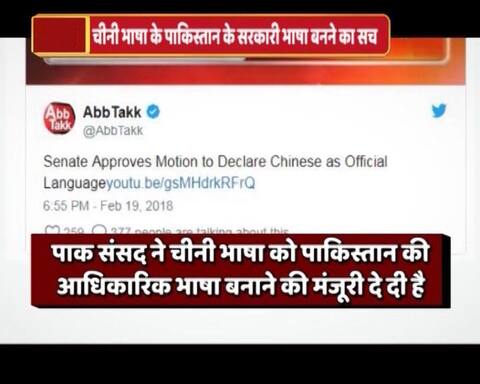 पाकिस्तानी चैनल के हवाले से वायरल हुई खबर पाकिस्तानी न्यूज़ चैनल अब तक पर एक खबर चली. इस खबर में एंकर कह रही है, ''सीनट ने चीनी जुबान को सरकारी जुबान का दर्जा देने की बात को मंजूर कर ली है. कहा गया है कि पाकिस्तान और चीन के बीच बढ़ते तालुक्कात को देखते हुए ऐसा करना जरूरी है.''