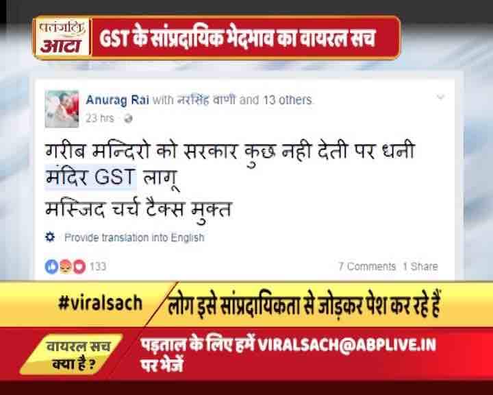 सोशल मीडिया पर लोग कह रहे हैं कि देश में जीएसटी के नाम पर जो ऐतिहासिक बदलाव हुआ है उसमें मंदिर और मस्जिद के बीच भेदभाव किया गया है. वायरल मैसेज में लिखा, ''या तो मुगल ही हिंदुओं से जजिया वसूलते थे या अब मोदी वसूलेंगे. जितने भी देवस्थान बोर्ड हैं वहां जो कोई एक हजार रुपए से ज्यादा का चढ़ावा देगा सरकार उस चढ़ावे मंदिर से टैक्स वसूल करेगी. इस तरह देश के दो बड़े मंदिर तिरुपति बालाजी और वैष्णोदेवी मंदिर जीएसटी के दायरे में आ गए हैं.''