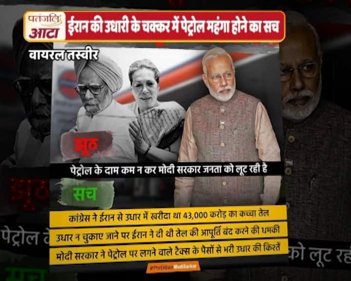 नई दिल्ली: सोशल मीडिया पर पेट्रोल के बढ़ते हुए दाम के पीछे बिल्कुल नया और अनोखा तर्क दिया जा रहा है. दावा है ईरान का उधार चुकाने के चक्कर में देश में पेट्रोल महंगा हो गया है. सोशल मीडिया पर यह दावा एक तस्वीर के जरिए किया जा रहा है. वायरल तस्वीर में सोनिया गांधी, पूर्व प्रधानमंत्री मनमोहन सिंह और वर्तमान पीएम नरेंद्र मोदी की तस्वीरें भी हैं.