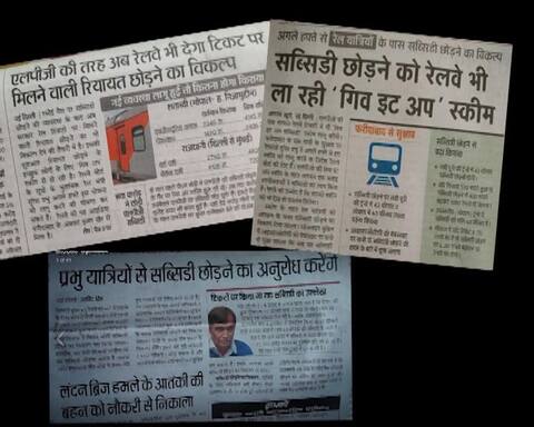तस्वीर के जरिए क्या दावा किया जा रहा है ? सोशल मीडिया पर अखबार में छपी एक खबर की कटिंग के जरिए दावा किया जा रहा है कि सब्सिडी छोड़ने को रेलवे भी गिव इट अप स्कीम ला रही है. एलपीजी की तरह अब रेलवे भी टिकट पर मिलने वाली रियायत छोड़ने का विकल्प देगा, प्रभु यात्रियों से सब्सिडी छोड़ने का अनुरोध करेंगे.