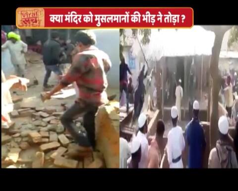 क्या दावा कर रहा है वीडियो? सोशल मीडिया पर पहुंचे दो वीडियो राजस्थान के एक मंदिर में मुसलमानों के हमले का दावा कर रहे हैं. वायरल वीडियो में सफेद टोपी लगाए लोग लाठी डंडों से एक इमारत पर ताबड़तोड़ हमले करते दिखाई दे रहे हैं. सोशल मीडिया वीडियो को हमले के सबूत के तौर पर पेश कर रहा है. क्या दिख रहा है वायरल वीडियो में? 3 मिनट 15 सेकेंड के इस वायरल वीडियो सिर्फ बरसती लाठियों और तोड़फोड़ का शोर सुनाई दे रहा है. भीड़ किसी भी कीमत पर वीडियो में दिख रही इमारत को मिट्टी में मिलाने पर आमादा है. वीडियो की शुरुआत में भीड़ एक पिलर पर डंडे बरसाती दिखाई देती है. बार-बार चोट करने पर पिलर गिर जाता है. इसके बाद पिलर के साथ वाली दीवार को गिराने की कोशिश होती है. धीरे-धीरे वो दीवारें भी ढहने लगती हैं. दावा ये है कि गिराई जा रही ये दीवारें किसी आम घर की नहीं बल्कि एक मंदिर की हैं. इसके बाद गुस्से से पागल हुई भीड़ सामने एक घर की तरफ बढ़ती है. घर की छत पर ताबड़तोड़ डंडे बरसाए जाते हैं. वीडियो में शोर बढ़ने लगता है और लगातार हमलों के बाद इस घर की छत हिलने लगती है. और कुछ सेकेंड बाद टीन की ये छत धराशायी हो जाती है. दूसरे वीडियो में क्या दिख रहा है? सोशल मीडिया पर वायरल दूसरे वीडियो को तोड़फोड के बाद का बताया जा रहा है. जहां टूटी हुई इमारत के पत्थर जमीन पर गिरे हुए हैं. महिलाओं के रोने की आवाज सुनाई दे रही है. पीले रंग की साड़ी में दिख रही एक महिला रो रही है. एक महिला किसी की गोद में है जो शायद बेहोश है. पीली साड़ी में महिला बिलख-बिलख कर रो रही है. वायरल वीडियो साथ मैसेज भी वायरल वीडियो के साथ एक मैसेज भी वायरल हो रहा है. इस वायरल वीडियो में लिखा है, "10 फरवरी 2018 की घटना. जागो हिंदू जागो, अभी नहीं तो कभी नहीं. राजस्थान गांव रानीपुरा तहसील हिंडोली जिला बूंदी. हिन्दू मंदिर मे कई पीढ़ियों से पूजा-पाठ होती आ रही है लेकिन मुसलमानों ने तोड़फोड़ की. औरतों, बच्चों और पब्लिक को भी मारा जा रहा है.'' एबीपी न्यूज़ ने शुरू की पड़ताल एबीपी न्यूज़ वायरल हो रहे दोनों वीडियो और मैसेज की पड़ताल की. वीडियो साथ वायरल हो रहे मैसेज से सुराग लेकर एबीपी न्यूज़ की टीम राजस्थान के बूंदी पहुंची. शुरुआती पड़ताल में पता चला कि कुछ दिन पहले बूंदी के रानीपुरा गांव में तोड़फोड़ जरूर हुई थी लेकिन किसी मंदिर को नहीं तोड़ा गया. रघुनाथ मंदिर के पुजारी के घर और शौचालय में तोड़फोड़ हुई थी. पड़ताल में पता चला कि पुजारी के घर में हुई तोड़फोड़ का मामला बीती 4 फरवरी का है जब गांव के ही प्रजापति समाज और मंदिर के पुजारी के बीच विवाद हुआ था. ये विवाद इतना बढ़ गया कि प्रजापति समाज के लोगों ने पुजारी के घर और शौचालय को तोड़ दिया. वायरल वीडियो में रोती दिख रही महिलाएं पुजारी के परिवार की हैं. दूस