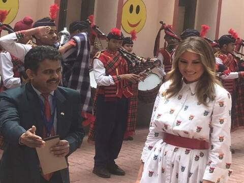 छात्रों के बैंड ने बैगपाइप बजाकर अमेरिका की प्रथम महिला का स्वागत किया मेलानिया के मोती बाग स्थित सर्वोदय को-एड सीनियर सेकेंडरी स्कूल पहुंचने पर परंपरागत परिधान पहने उत्साहित छात्रों ने उनका स्वागत किया. मेलानिया के स्वागत में स्कूल को फूलों से सजाया गया था. स्कूल में फूलों से रंगोली बनाई गई थी. छात्रों के बैंड ने बैगपाइप बजाकर अमेरिका की प्रथम महिला का स्वागत किया.