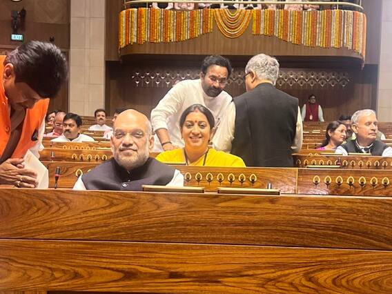 लोकसभा चैंबर में खींची गई इस तस्वीर में आगे अमित शाह पोज देते हुए नजर आ रहे हैं. उनके पीछे वाली कतार में स्मृति ईरानी मुस्कराते हुई बैठी दिखाई दे रही हैं. ईरानी के पीछे केंद्रीय पर्यटन मंत्री जी किशन रेड्डी भी खड़े होकर बात करते फ्रेम में आ गए हैं.