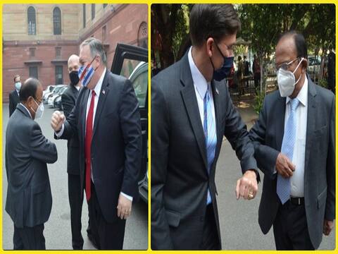 नई दिल्ली: अमेरिकी विदेश मंत्री माइक पोम्पिओ और रक्षा मंत्री मार्क टी एस्पर ने मंगलवार को राष्ट्रीय सुरक्षा सलाहकार (एनएसए) अजित डोभाल से दोनों देशों के बीच रणनीतिक संबंधों के महत्वपूर्ण पहलुओं पर बातचीत की . सूत्रों ने बताया कि बैठक में रणनीतिक लिहाज से महत्वपूर्ण मुद्दों पर चर्चा हुई. कोरोना काल के बीच अजित डोभाल और अमेरिकी मंत्रियों की मुलाकात ने सबका ध्यान खींचा. सभी ने आपस में कोहनियां टकराकर अभिवादन किया.