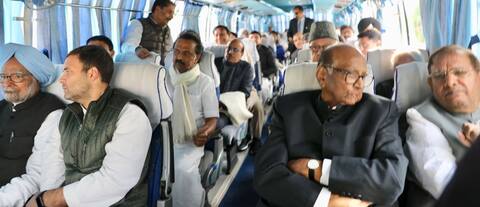 इस तरह बस में सवार होकर इतनी बड़ी संख्या में विपक्ष के नेताओं का पहुंचना अपने आप में खास बात रही. इसमें सबसे आगे कांग्रेस अध्यक्ष राहुल गांधी पूर्व प्रधानमंत्री मनमोहन सिंह के साथ बैठे थे. इस तरह बस में सवार होकर इतनी बड़ी संख्या में विपक्ष के नेताओं का पहुंचना अपने आप में खास बात रही. इसमें सबसे आगे कांग्रेस अध्यक्ष राहुल गांधी पूर्व प्रधानमंत्री मनमोहन सिंह के साथ बैठे थे. उनके साथ वाली सीट पर शरद पवार और शरद यादव बैठे थे. राहुल गांधी और मनमोहन सिंह के पीछे एम के स्टालिन सवार थे.
