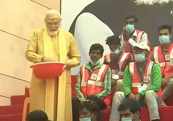 पीएम मोदी ने श्रमिकों के साथ फोटो भी खिंचवाई