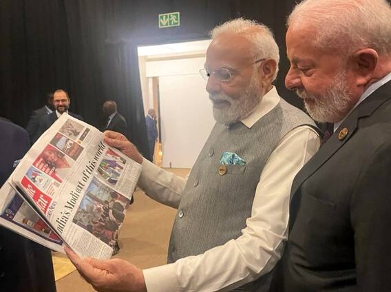 विदेश मंत्री एस जयशंकर ने गुरुवार (24 अगस्त) को दक्षिण अफ्रीकी अखबार की हेडलाइन पढ़ते हुए पीएम मोदी की ये तस्वीर शेयर की है. इसमें पीएम अखबार पढ़ते हुए मुस्कुरा रहे हैं. दक्षिण अफ्रीकी अखबार ने अंग्रेजी में हेडलाइन लिखी है- "इंडियाज मोदी आउट ऑफ दिस वर्ल्ड." पीएम मोदी के साथ ब्राजील के राष्ट्रपति लुइज इनासियो लूला दा सिल्वा भी नजर आ रहे हैं.