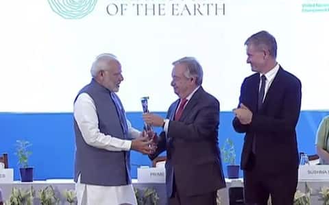 नई दिल्ली: दिल्ली में एक विशेष सम्मान समारोह में प्रधानमंत्री नरेंद्र मोदी को संयुक्त राष्ट्र की ओर से ‘चैम्पियंस ऑफ द अर्थ अवॉर्ड’ दिया गया. प्रधानमंत्री को यह सम्मान संयुक्त राष्ट्र के महासचिव एंटोनियो गुटरेस ने अंतरराष्ट्रीय सौर गठबंधन के नेतृत्व और 2022 तक भारत को एकल इस्तेमाल वाले प्लास्टिक से मुक्त कराने के संकल्प को लेकर दिया.