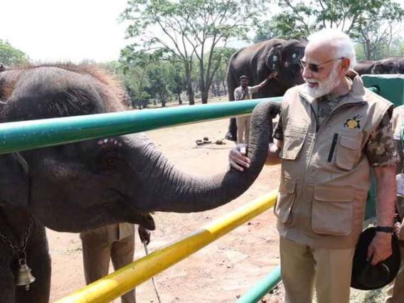 PM Modi's Visit: प्रधानमंत्री नरेंद्र मोदी ने तमिलनाडु के मुदुमलाई टाइगर रिजर्व का दौरा किया. इस दौरान पीएम मोदी ने थेप्पाकडू हाथी शिविर में हाथियों को गन्ना खिलाया. पीएम मोदी ने हाथी शिविर में महावतों और कावड़ियों से भी बातचीत की. इस दौरान पीएम मोदी खाकी पैंट, कैमॉफ्लाज टी-शर्ट और एडवेंचर गॉइलेट स्लीवलेस जैकेट के साथ अलग अंदाज में नजर आए.