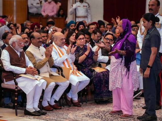 Hirbai Ibrahim Lobi Receives Padma Shri: राष्ट्रपति द्रौपदी मुर्मू (Droupadi Murmu) ने बुधवार (22 मार्च) को आर्ट, पब्लिक अफेयर, साइंस जैसी फील्ड से जुड़े लोगों को समाज की भलाई के लिए उनके योगदान की वजह से उन्हें सम्मान किया. मुर्मू ने 106 पद्म पुरस्कारों से लोगों को सम्मानित किया. इसी कार्यक्रम का एक वीडियो सोशल मीडिया पर वायरल हो रहा है, जिसमें प्रधानमंत्री नरेंद्र मोदी पद्मश्री पुरस्कार विजेता हीरबाई इब्राहिम लोबी को सिर झुकाकर और हाथ जोड़कर नमन करते हुए नजर आ रहे हैं.