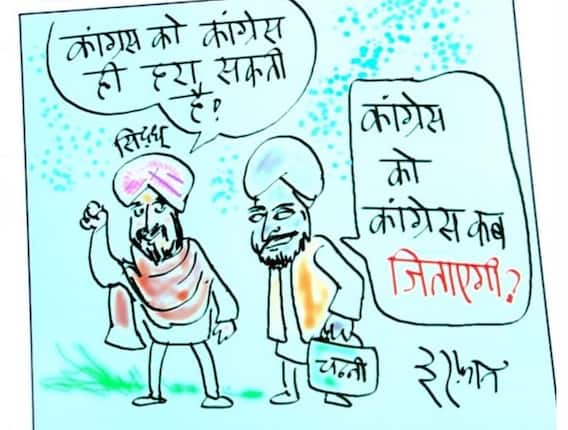 इरफान ने अपने कार्टून में सिद्धू और मुख्यमंत्री चरणजीत सिंह चन्नी को दिखाया है. सिद्धू कह रहे हैं- ''कांग्रेस को कांग्रेस ही हरा सकती है.'' इस पर चन्नी पूछ रहे हैं- कांग्रेस को कांग्रेस कब जिताएगी? आप भी देखें कार्टून.