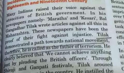 राजस्थान राज्य टेक्स्टबुक बोर्ड की यह किताब हिंदी में प्रकाशित है. यह किताब अंग्रेजी माध्यम के छात्रों को संदर्भ पुस्तक के तौर पर भेजी गई है. पुस्तक के 22 वें अध्याय के पेज नंबर 267 आपत्ति जनक तथ्य लिखा गया है. 18-19 वीं शताब्दी के राष्ट्रीय आंदोलन की घटनाएं शीर्षक से जुड़े पाठ में कहा गया है कि तिलक ने राष्ट्रीय आंदोलन में उग्र प्रदर्शन के पथ को अपनाया था. और यही वजह है कि उन्हें 'आतंक का पितामह' कहा जाता है.