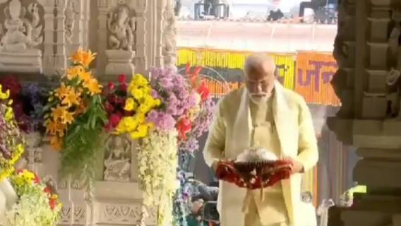 पीएम मोदी सुबह करीब 10.45 बजे राम मंदिर प्राण प्रतिष्ठा में शामिल होने के लिए अयोध्या पहुंचे. यहां से पीएम मोदी राम मंदिर पहुंचे. यहां वे राम मंदिर में पीतांबर वस्त्र धारण कर पहुंचे. उन्होने धोती और कुर्ता पहना. साथ ही गले में सफेद रंग का पटका भी डाला. पीएम मोदी प्रभु श्रीराम के लिए चांदी का छत्र लेकर पहुंचे, जिसे उन्होंने पुजारी को सौंपा. पीएम मोदी के अलावा कार्यक्रम में उत्तर प्रदेश के मुख्यमंत्री योगी आदित्यनाथ, संघ प्रमुख मोहन भागवत और राज्यपाल आनंदीबेन पटेल शामिल हुए.