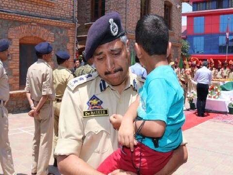 जम्मू-कश्मीर पुलिस ने एसएसपी और उहबान की दो तस्वीर ट्वीट की है. पुलिस ने कहा, ''जिला पुलिस लाइंस श्रीनगर में श्रद्धांजलि समारोह के दौरान एसएसपी श्रीनगर डॉ एम हसीब की गोद में शहीद अरशद खान का बेटा.''