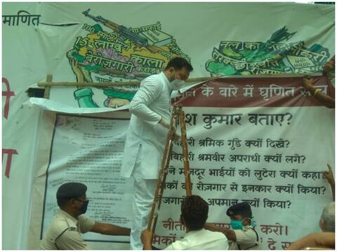 तेजस्वी यादव ने खुद से आरजेडी कार्यालय के बाहर बैनर लगाया और इस पोस्टर के जरिए मुख्यमंत्री नीतीश कुमार से कई सवाल पूछे. उन्होंने बिहार के गरीबों और श्रमिकों को अपशब्द कहने और उन्हें अपराधी बताने वाले होर्डिंग भी लगाए.