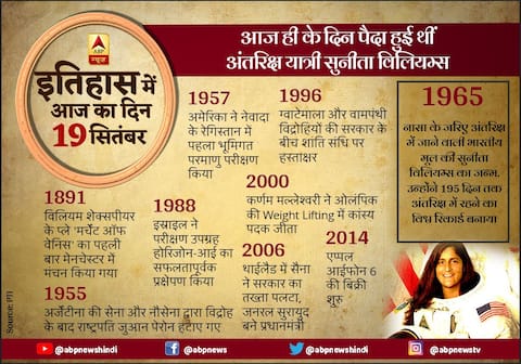 नई दिल्ली: आज ही के दिन भारतीय मूल की अमेरिकी अंतरिक्ष यात्री सुनीता विलियम्स का जन्म हुआ था. अमेरिका के ओहायो राज्य के यूक्लिड शहर में 19 सितंबर, 1965 को जन्मी सुनीता विलियम्स ने एक अंतरिक्ष यात्री के रूप में 195 दिन तक अंतरिक्ष में रहने का विश्व रिकार्ड बनाया और एक महिला यात्री के तौर पर सबसे ज्यादा बार अंतरिक्ष में चहलकदमी करने का रिकार्ड भी एक समय उनके नाम पर है. इतिहास के पन्नों में 19 सितंबर की तारीख में दर्ज अन्य महत्वपूर्ण घटनाओं का सिलसिलेवार ब्यौरा इस प्रकार है-1891 : विलियम शेक्सपीयर के विश्व प्रसिद्ध नाटक “मर्चेंट ऑफ वेनिस” का पहली बार मेनचेस्टर में मंचन किया गया. 1955 : अर्जेंटीना की सेना और नौसेना द्वारा विद्रोह के बाद राष्ट्रपति जुआन पेरोन हटाए गए. 1957 : अमेरिका ने नेवादा के रेगिस्तान में पहला भूमिगत परमाणु परीक्षण किया. 1965 : अमेरिकी अंतरिक्ष एजेंसी नासा के जरिए अंतरिक्ष जाने वाली भारतीय मूल की सुनीता विलियम्स का जन्म.1983 : ब्रिटिश उपनिवेश कैरीबियन द्वीप, सेंट कीट्स एवं नेविस स्वतंत्र. 1988 : इस्राइल ने परीक्षण उपग्रह होरिजोन-आई का सफलतापूर्वक प्रक्षेपण किया. 1996 - एलिजा इजेत्बोगोविक युद्ध के बाद बोस्निया के पहले राष्ट्रपति बने. 1996 : ग्वाटेमाला और वामपंथी विद्रोहियों की सरकार के बीच शांति संधि पर हस्ताक्षर.2000 : कर्णम मल्लेश्वरी ने ओलंपिक की Weight Lifting में कांस्य पदक जीता2006 : थाईलैड में सैना ने सरकार का तख्ता पलटा, जनरल सुरायुद बने प्रधानमंत्री. 2008 : सर्वोच्च न्यायालय ने छत्तीसगढ़ में नक्सलियों पर अंकुश लगाने के इरादे से शुरू किए गए सलवा जुडूम अभियान पर रोक लगाई. 2014 - एप्पल आईफोन 6 की बिक्री शुरु.