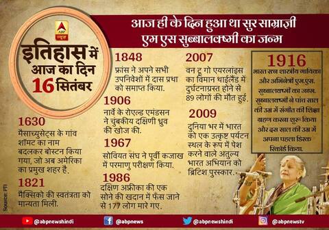 16 सितंबर की तारीख में इतिहास में दर्ज देश विदेश की प्रमुख घटनाओं का सिलसिलेवार ब्यौरा इस प्रकार है:-
