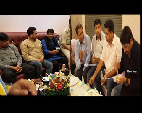 ऐसी ही एक और तस्वीर वायरल हो रही है. इस तस्वीर में मनोज तिवारी और कपिल मिश्रा के कपड़े तो बदले दिख रहे है लेकिन इस त्वीर में दोनों के आगे खाने-पीने का सामान यहां भी मौजूद है.