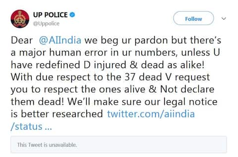 सोशल मीडिया में ख़ास तौर से ट्विटर पर यूपी पुलिस बहुत एक्टिव है. जैसे ही उसे एमनेस्टी इंडिया के इस ट्वीट के बारे में पता चला वो ‘एक्शन’ में आ गई. यूपी पुलिस ने ट्वीट किया “ आपने संख्या बताने में बड़ी भूल की है. मुठभेड़ में सिर्फ़ 37 लोग मारे गए हैं और आपने ज़िंदा लोगों को भी मरा हुआ बता दिया, ऐसा तो न करें, वैसे हम पूरा रिसर्च कर आपको लीगल नोटिस भेजेंगे.”