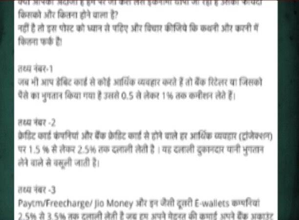 मैसेज में लिखा है, ''अगर 1 नंबर में यानि व्हाइट मनी में हुए 75 लाख करोड़ के आर्थिक व्यवहार को कैशलेस कर देंगे तो क्या होगा? Paytm, Freecharge, Jio Money और इन जैसी दूसरी E-wallets कंपनियों की चांदी हो जायेगी. 75 लाख करोड़ के कैशलैस आर्थिक व्यवहार पर अगर ये निजी कंपनियां औसतन 2 फीसदी कमीशन भी लेती हैं तो सीधे-सीधे हर साल डेढ़ लाख करोड़ रुपये इन कंपनियों को मिलेगा. बिना कुछ किये धरे. पैसा जनता का, माल व्यापारी का और ये कंपनियां मुफ्त में माल उड़ाएंगी.''
