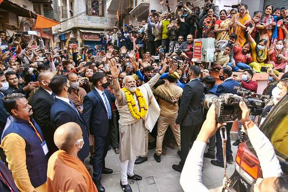 पीएम मोदी काल भैरव मंदिर में दर्शन करने के बाद बनारस की संकरी गलियों से होकर गुजरे. यहां लोगों ने उनका शानदार स्वागत किया और उनपर गुलाब के फूलों की बारिश की. साथ की 'मोदी-मोदी' और 'हर हर महादेव' के नारे लगाए. काशी-विश्वनाथ कॉरिडोर के लोकार्पण के मौके पर पूरे वाराणसी को दुल्हन की तरह सजाया गया है.