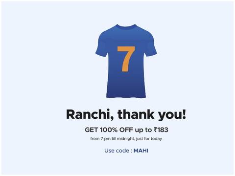 धोनी के रिटायरमेंट के ऐलान के बाद फूड डिलीवरी प्लेटफॉर्म जोमैटो ने रांची वालों को खास तोहफा दिया. उसने कैप्टन कूल के सम्मान में 100 फीसद का डिस्काउंट (183 रुपये) ऑफर की पेशकश की.
