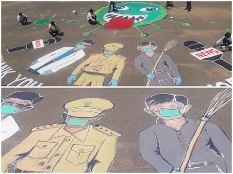 जम्मू: कोरोना वायरस को हराने के लिए जारी लॉकडाउन के बीच कोरोना सेनानियों का शुक्रिया अदा करने और आम जनता में इससे बचने के लिए जागरूकता लाने के मक़सद से जम्मू के म्यूजिक एंड फाइन आर्ट्स कॉलेज के छात्रों ने अनोखी पहल की है. लॉकडाउन के दौरान इस कॉलेज के छात्र सड़को पर पेंटिंग बनाकर कोरोना को हराने का संदेश दे रहे हैं. जम्मू के म्यूजिक एंड फाइन आर्ट्स कॉलेज के छात्रों ने जम्मू विश्वविधालय के मुख्य चौराहे पर कोरोना के खिलाफ लड़ाई में अहम भूमिका निभा रहे डॉक्टरों, पुलिस, मीडिया और सफाई कर्मचारियों का आभार जताने वाली पेंटिंग बनाई है. म्यूजिक एंड फाइन आर्ट्स कॉलेज की प्रिंसिपल सतनाम कौर के मुताबिक लॉकडाउन के चलते दूसरे कॉलेजो की तरह ही उनका कॉलेज भी बंद है, लेकिन इसी लॉकडाउन के बीच यहां के छात्रों ने अपने सामाजिक दायित्व को निभाते हुए ऐसी पेंटिंग बनाने का फैसला किया.