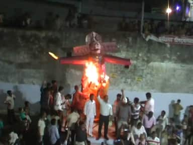 इलाहाबाद: दशहरे के मौके पर संगम नगरी इलाहाबादय/प्रयागराज में भी जगह-जगह रावण के पुतले जलाए जा रहे हैं. शहर के मीरापुर इलाके में पजावा रामलीला कमेटी की तरफ से पैंतीस फिट ऊंचे रावण के पुतले को जलाया गया.