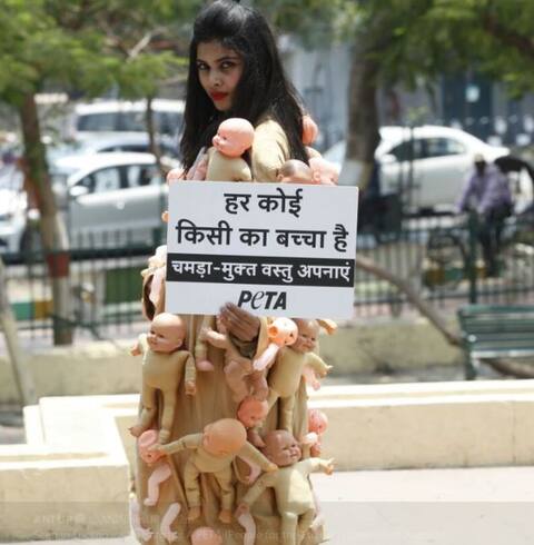 लखनऊ: यूपी की राजधानी लखनऊ में पीपुल फार द एथिकल ट्रीटमेंट आफ एनिमल्स(पेटा) की एक कार्यकर्ता ने अनोखे अंदाज में शहर के हजरतगंज इलाके में लेदर का इस्तेमाल ना करने वाले बोर्ड के साथ लोगों को संदेश दिया. महिला कार्यकर्ता के हाथ में बहुत सारे रबर के गुड्डे थे जिनपर एक ही तरह के कपड़े लगे हुए थे. जो देखने से स्किन कलर की तरह लग रहे थे. उन सबके साथ उसके पास एक पेम्पलेट भी था जिसपर लिखा था,' चमड़ा-मुक्त वस्तुएं अपनाएं' हर कोई किसी का बच्चा है.