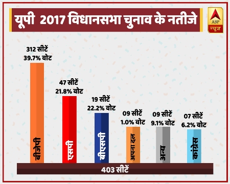 उत्तर प्रदेश: उत्तर प्रदेश में भारतीय जनता पार्टी प्रचंड बहुमत लेकर सत्ता पर काबिज होने जा रही है. उत्तर प्रदेश विधानसभा के नतीजों ने ये साफ कर दिया कि देश में अभी भी मोदी लहर कायम है. यूपी में बीजेपी और उसके सहयोगी दलों को 325 सीटें मिली हैं. बीजेपी ने खुद 312 सीटों पर कब्जा जमाया है. आपको बता दें यूपी में बीजेपी का वोट प्रतिशत सबसे ज्यादा 39.7% रहा है.
