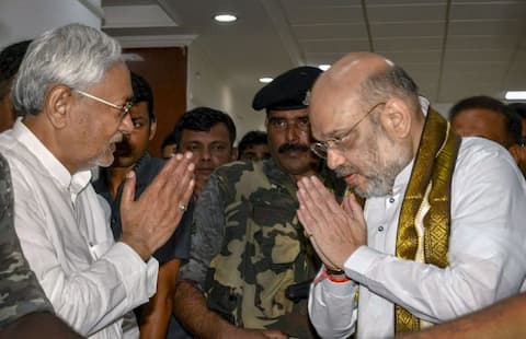 शाह के हवाईअड्डे से अतिथि गृह पहुंचने के कुछ मिनट के अंदर नीतीश कुमार वहां पहुंचे. बिहार प्रभारी और बीजेपी के राष्ट्रीय महासचिव भूपेंद्र यादव ने मुख्य द्वार पर नीतीश कुमार का गर्मजोशी से स्वागत किया और वह कुमार को उस कक्ष तक लेकर गये जहां शाह मौजूद थे. शाह, बिहार के उपमुख्यमंत्री सुशील कुमार मोदी और प्रदेश बीजेपी अध्यक्ष नित्यानंद राय की मौजूदगी में कुमार ने इस मौके पर मौजूद फोटोग्राफरों के लिये मुस्कुराकर तस्वीरें खिंचाईं.