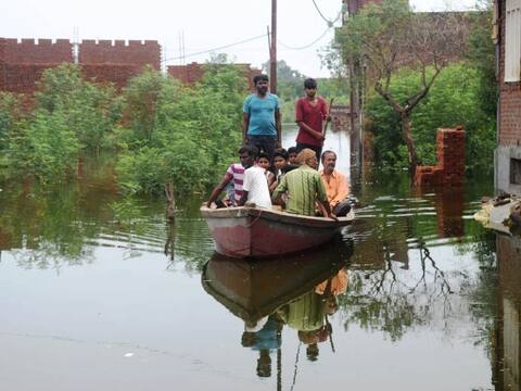 मुरादाबाद में भारी बारिश के बाद सड़कों पर भरा पानी, चलानी पड़ रही हैं नावें